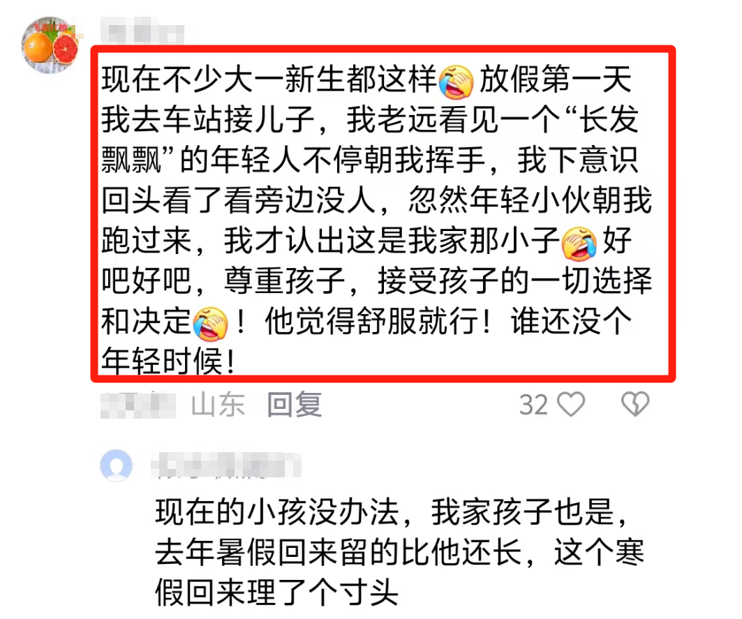 评论区有一名山东的家长也证实了这一点:现在不少大一新生都是这样,自己放假第一天去车站接儿子回家,离老远就看见一个“长发飘飘”的年轻人不停地朝自己招手,回头看了看周围没别人,直到这位长发飘飘的男孩子朝自己招手,才确定那是自己儿子。